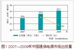 2009年被稱作中國3G的元年,3G網(wǎng)絡(luò)的建設(shè)直接帶來達上千億元規(guī)模的投資,配套設(shè)備同步增長,通信電源需求旺盛。2009年,中國通信電源市場收入達到37億元人民幣,較2008增長了27.6%,通信電源出貨量達35.7萬套,較2008年增長了 8.5%,如圖1所示。