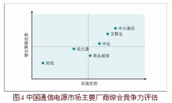 應(yīng)用Frost&Sullivan公司GEM研究方法,從增長戰(zhàn)略及實施力兩個緯度,綜合評估中國通信電源市場主要供應(yīng)商,如圖4所示。
