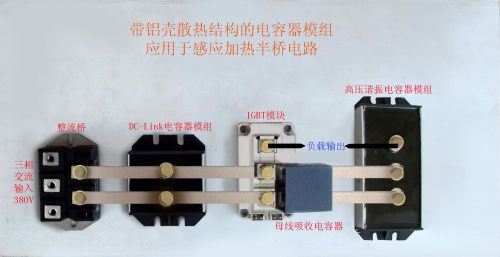 感應加熱設備電路結構分為兩種.從市面上的產品來看,30KW以內采用的是半橋.30KW以上采用的是全橋.以半橋30KW機芯來看,薄膜電容器的使用情況如下: