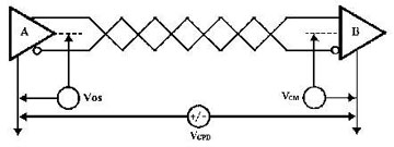 • 共模干擾問題。的確,RS-485接口采用差分方式傳輸信號(hào),并不需要相對(duì)于某個(gè)參照點(diǎn)來檢測(cè)信號(hào),系統(tǒng)只需檢測(cè)兩線之間的電位差就可以了。但應(yīng)該注意的是,收發(fā)器只有在共模電壓不超出一定范圍(-7V至+12V)的條件下才能正常工作。當(dāng)共模電壓超出此范圍就會(huì)影響通信的可靠,直至損壞接口。如圖3所示,當(dāng)發(fā)送器A向接收器B發(fā)送數(shù)據(jù)時(shí),發(fā)送器A的輸出共模電壓為VOS,由于兩個(gè)系統(tǒng)具有各自獨(dú)立的接地系統(tǒng),存在著地電位差VGPD。那么,接收器輸入端的共模電壓就會(huì)達(dá)到VCM=VOS+VGPD。RS-485標(biāo)準(zhǔn)規(guī)定VOS≤3V,但VGPD可能會(huì)有很大幅度(十幾伏甚至數(shù)十伏),并可能伴有強(qiáng)干擾信號(hào),致使接收器共模輸入VCM超出正常范圍,并在信號(hào)線上產(chǎn)生干擾電流,輕則影響正常通信,重則損壞接口。