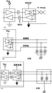 圖5a所示為隔離保護(hù)方案。這種方案實(shí)際上將瞬態(tài)高壓轉(zhuǎn)移到隔離接口中的電隔離層上,由于隔離層的高絕緣電阻,不會(huì)產(chǎn)生損害性的浪涌電流,起到保護(hù)接口的作用。通常采用高頻變壓器、光耦等元件實(shí)現(xiàn)接口的電氣隔離,已有器件廠商將所有這些元件集成在一片IC中,使用起來非常簡(jiǎn)便,如Maxim公司的MAX1480/MAX1490,隔離電壓可以到2500V。這種方案的優(yōu)點(diǎn)是可以承受高電壓、持續(xù)時(shí)間較長(zhǎng)的瞬態(tài)干擾,實(shí)現(xiàn)起來也比較容易,缺點(diǎn)是成本較高。