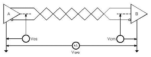 如圖1所示,當(dāng)發(fā)送器A向接收器B發(fā)送數(shù)據(jù)時,發(fā)送器A的輸出共模電壓為VOS,由于兩個系統(tǒng)具有各自獨(dú)立的接地系統(tǒng)存在著地電位差VGPD,那么接收器輸入端的共模電壓就會達(dá)到VCM=VOS+VGPD。RS-485標(biāo)準(zhǔn)規(guī)定VOS≤3V,但VGPD可能會有很大幅度(十幾伏甚至數(shù)十伏),并可能伴有強(qiáng)干擾信號致使接收器共模輸入VCM超出正常圍,在信號線上產(chǎn)生干擾電流輕則影響正常通信,重則損壞設(shè)備。