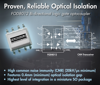 為幫助設(shè)計(jì)人員應(yīng)對(duì)挑戰(zhàn),飛兆半導(dǎo)體公司(Fairchild Semiconductor)開發(fā)出業(yè)界首款全雙工、雙向邏輯門光耦合器FOD8012,它具有高抗噪能力和經(jīng)驗(yàn)證的可靠光隔離性能,適用于工業(yè)現(xiàn)場(chǎng)總線通信、可編程邏輯控制、伺服控制,以及逆變器、工廠自動(dòng)化、過程控制和測(cè)試測(cè)量等應(yīng)用。