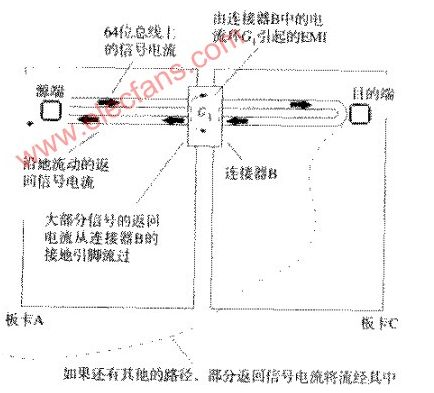 一個(gè)64位總線從板卡A經(jīng)過連接器B連到母板卡上,母板卡可能是一個(gè)主CPU卡或是一個(gè)通往其他子卡的無源通道。64條信號(hào)線的返回電流從母板卡C流回板卡A,其中的絕大部分通過了連接器B的接地腳。