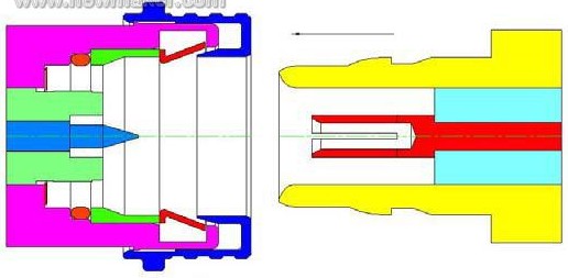 1) 這個(gè)設(shè)計(jì)巧妙地把彈簧片設(shè)置在公頭外導(dǎo)體后部,讓公母頭的外導(dǎo)體端面之間實(shí)現(xiàn)剛性接觸,從而達(dá)到端面零間隙,完全符合平面接頭的設(shè)計(jì)原則,使接頭性能得到較大提高,這與QN 把簧片設(shè)置在兩外導(dǎo)體端面之間相比,顯然是一個(gè)進(jìn)步。