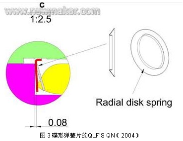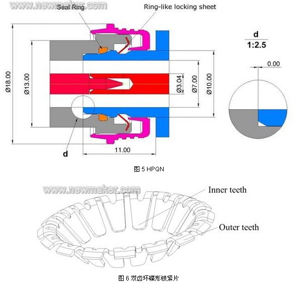 繼 SnapN 之后,07 年Anoison 推出了HPQN 設(shè)計(jì),該設(shè)計(jì)在公頭內(nèi)嵌入一雙齒環(huán)碟形鎖緊片(如圖6),當(dāng)公頭和母頭配合后, 固定在公頭上的雙齒環(huán)碟形鎖緊片緊扣在母頭斜面上,其內(nèi)齒的端面對母頭產(chǎn)生推力作用,使外導(dǎo)體的端面之間緊密接觸,間隙為0。并且雙齒環(huán)碟形鎖緊片相鄰的內(nèi)齒長度有差異,使鎖緊時(shí)內(nèi)齒停留在母頭斜面的不同圓周上。這種設(shè)計(jì)利用雙齒環(huán)碟形鎖緊片內(nèi)齒的彈力和母頭斜面的支撐力,巧妙地實(shí)現(xiàn)了公頭和母頭端面之間的保持力和接觸壓力,并能達(dá)到非常好的抗震效果。該設(shè)計(jì)的力學(xué)原理很簡單,但是鎖緊片與母頭相對最佳位置的數(shù)據(jù)需要經(jīng)歷大量的試驗(yàn)。