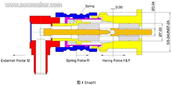 但跟傳統(tǒng)的螺紋連接的N 相比,SnapN 還是有局限性。我們知道 SnapN 外導(dǎo)體端面之間的接觸壓力由其彈簧A 提供--ROSERBERGER 提供的數(shù)據(jù)是30N,根據(jù)力的相互作用原理,我們可以知道接頭的結(jié)合力也是30N。在某些應(yīng)用場合,由于粗重電纜的擺動,傳導(dǎo)到接頭的作用力很容易超30N,一旦超過這個(gè)臨界力,外導(dǎo)體端面之間會發(fā)生瞬時(shí)分離,而影響信號傳輸。那是否能提高這個(gè)臨界力呢?我們知道,彈簧A 對外導(dǎo)體端面提供的接觸壓力與接頭的結(jié)合力是等量的,如果我們增加彈簧作用力---比如增加到100N,那意味著接頭結(jié)合力也達(dá)到100N,顯然,匹配一對接頭需要用100N 的力氣是讓人無法接受的。