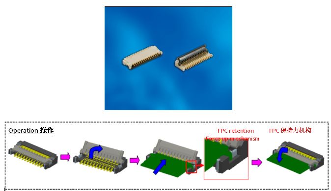 FCI可提供高度最低的FFC/FPC連接器:0.5毫米間距,0.7毫米高度,反向觸發(fā)執(zhí)行器ZIF(零插入力),用于背景燈和觸摸屏連接; 0.2毫米間距,0.9毫米高度,零插入力,適用于顯示器,鍵盤和揚(yáng)聲器連接。