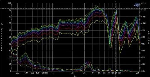 圖1:揚(yáng)聲器+音箱頻率響應(yīng)以及信號(hào)電平失真。