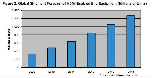 據(jù)IHS iSuppli公司的研究,液晶電視和其它高級數(shù)字設(shè)備的事實性連接標準HDMI,將被2011年出現(xiàn)的將近6.3億個消費電子產(chǎn)品采用,充當(dāng)主要的設(shè)備接口,盡管在中國面臨另外一種標準的挑戰(zhàn)。