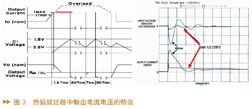 接下來以UCC3915為例說明熱插拔過程中輸出電流電壓的情況。圖3中,左邊圖形是UCC3915的輸出電流、輸出電壓、即時電容電壓的波形,可以看到當(dāng)輸出電流上升到ITRIP時,計(jì)時電容開始充電,電壓上升,開始計(jì)時;如果輸出電流超過ITRIP并一直上升到IMAX(設(shè)定的最大值),由于此時MOS管工作在線性模式,將最大輸出電流限制在這一水平而不讓輸出電流上升,因此輸出電流就會被限制在IMAX。