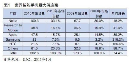2010年智能手機獲寵熱銷,世界頂級手機廠商經營冷熱互見,手機業(yè)老大諾基亞,以及名列三、四的LG和Sony-Ericsson都因未及時趕上智能手機浪潮而致市占率滑落,RIM、蘋果與宏達(HTC)等公司看準苗頭,強勢出擊,傾力經營智能手機而擴大了市占率,名列前八的Motorola則又因傳統(tǒng)手機跌幅太大而致市占率萎縮(見表1)。