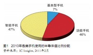 平均算來,現(xiàn)今一部手機使用的半導體價值約30美元,世界全部手機使用的半導體總值約占半導體市場近20%,是僅次于PC和消費電子的第三大應用產品,足見其影響力。智能手機的半導體含量更大,它裝備更加優(yōu)良的處理器,更多的DRAM和NAND。據(jù)稱,它與基本手機半導體含量之比約為9:1,其對半導體業(yè)的重要性更可見一斑。市場調研公司IC Isights報告指出,2010年世界手機使用半導體產品共425億美元,其中智能手機(Smartphone)200億美元,占47%,首次超過增強型手機(Enhanced),基本型手機(Basic)用半導體僅30億美元,占7%(見圖1)。預計2014年手機使用半導體將增至555億美元,年均增長率7.5%,智能手機使用半導體則將以每年20%的速度迅猛成長,屆時將達416億美元,獨占手機用半導體的75%,相反基本型手機屆時將進一步縮減至僅為16億美元,只及2010年的一半。