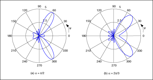 除了改變波瓣的寬度,通過對(duì)連續(xù)單個(gè)天線的信號(hào)設(shè)定固定的相位延遲α(圖3),還可以實(shí)現(xiàn)主波瓣在x–y平面內(nèi)的旋轉(zhuǎn)。天線陣列的輻射圖正比于天線陣列系數(shù)F(u):