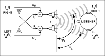 當(dāng)兩個(gè)揚(yáng)聲器的間距逐漸縮小時(shí),這種時(shí)延逐漸縮小,直到最后兩個(gè)揚(yáng)聲器聽起來如同一個(gè)揚(yáng)聲器的效果。這種串?dāng)_會(huì)使人腦“意識(shí)”到兩個(gè)音源距離非常近。為了從緊湊的音源間距獲得相隔較遠(yuǎn)的音源效果,必須消除耳間串?dāng)_。在每個(gè)揚(yáng)聲器中加入抵消另一個(gè)揚(yáng)聲器聲音的信號(hào),在音源前端消除聽覺串?dāng)_。這種串?dāng)_的消除使聽者感覺聲音發(fā)自相隔較遠(yuǎn)的音源信號(hào)3。