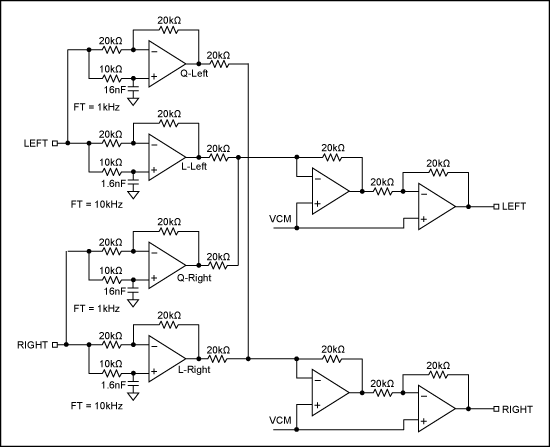無源方案可以實(shí)現(xiàn)該電路,但是更通用的方法是有源電路(圖7)。對(duì)于線性信號(hào)(相應(yīng)的輸入通道),電路呈現(xiàn)為一個(gè)ft=10kHz的相移濾波器,對(duì)于積分信號(hào)(另一路輸入),電路呈現(xiàn)為一個(gè)ft=1kHz的相移濾波器。目的是使線性輸入信號(hào)和積分信號(hào)之間在音頻帶寬1kHz至10kHz范圍內(nèi)呈現(xiàn)90°相移。