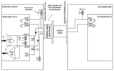 對(duì)于DDC信號(hào),雙模源端設(shè)備必須隔離AUXCH信號(hào)線上的耦合電容和DDC信號(hào)線。圖4給出了信號(hào)隔離的方法。