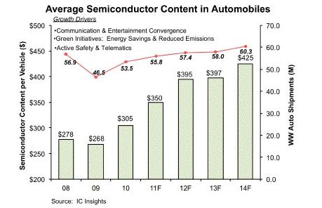 據(jù)預(yù)計(jì),汽車上裝備的半導(dǎo)體器件份額從2010年到2014年將以年均9%的速度增長,到2014年,平均每輛汽車上安裝的半導(dǎo)體設(shè)備的價值將提升到425美元左右。而驅(qū)動這種增長的則主要是通信應(yīng)用,娛樂類應(yīng)用,安全類應(yīng)用,遠(yuǎn)程控制類應(yīng)用以及環(huán)保類應(yīng)用。