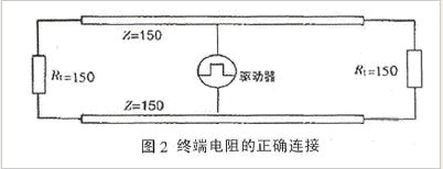 ②阻抗不連續(xù),顧名思義,與光從一種媒質(zhì)進(jìn)入另一種媒質(zhì)時(shí)所引起的反射是相似的。信號(hào)在傳輸線末端突然遇到電纜阻抗很小甚至沒(méi)有,信號(hào)在這個(gè)地方就會(huì)引起反射。消除這種反射最常用的方法,是在電纜的末端跨接一個(gè)與電纜的特性阻抗同樣大小的終端電阻,使電纜的阻抗連續(xù)。由于信號(hào)在電纜上的傳輸是雙向的,因此,在通訊電纜的另一端同樣要跨接一個(gè)相同大小的終端電阻,如圖2所示。