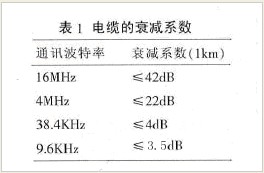 導(dǎo)線的電阻對(duì)信號(hào)的影響很小,可以忽略不計(jì)。電纜的分布電容C主要是由雙絞線的兩條平行導(dǎo)線產(chǎn)生。信號(hào)的損失主要是由于電纜的分布電容和分布電感組成的LC低通濾波器。通訊波特率越高,信號(hào)衰減也會(huì)越大。常規(guī)電纜的衰減系數(shù)見(jiàn)表1.
