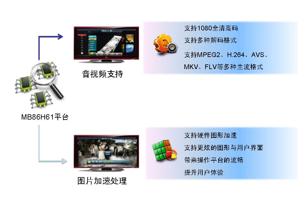 MB86H61系列芯片基于多核CPU架構(gòu),內(nèi)部集成了富士通獨(dú)有專利技術(shù)的硬件視頻處理器視頻解碼單元解碼全高清/標(biāo)清MPEG-2、H.264、VC-1、AVS、FLV、MKV等多種視頻格式,而音頻解碼單元則采用高性能的ARC725TM(594DMIPS)支持DD、DD+、AAC、DRA等多種先進(jìn)音頻格式。因此,該芯片的ARM11內(nèi)核主CPU將全部用于處理應(yīng)用程序,其性能將有足夠的裕量,能充分保證系統(tǒng)運(yùn)行的平穩(wěn)流暢。“獨(dú)立的硬件圖形加速功能還使其能更輕松地支持豐富的圖形用戶界面、高清圖片顯示,從而大大提升用戶體驗(yàn)。”富士通半導(dǎo)體業(yè)務(wù)發(fā)展總監(jiān)黃自力表示,“該芯片對于全高清AVS視頻解碼的支持尤其值得一提,目前市場上大部分的高清芯片所能支持的AVS解碼還停留在標(biāo)清階段。”