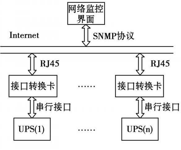 整個系統(tǒng)的核心為基于SNMP網(wǎng)絡(luò)管理協(xié)議的接口轉(zhuǎn)換卡。接口轉(zhuǎn)換卡一端通過網(wǎng)線與監(jiān)控計算機相連,管理人員通過計算機可方便地對其進行操作。接口轉(zhuǎn)換卡另一端通過與UPS上的串行接口連接,來獲取UPS工作的各種信息及參數(shù),然后再利用SNMP協(xié)議將接收到的數(shù)據(jù)轉(zhuǎn)換為管理信息庫(MIB)節(jié)點的變量值。管理員通過網(wǎng)絡(luò)管理軟件對MIB節(jié)點變量進行操作,從而獲得各UPS的監(jiān)控信息,實現(xiàn)了安全可靠的遠程分散式管理。