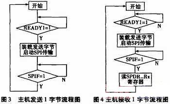 (2)軟件部分:單片機為主控制器,首先查詢從機狀態(tài)標志位READY是否為1,判斷是否可以與從機通信。從機準備就緒時,單片機可裝載1字節(jié)發(fā)送數(shù)據(jù),啟動CPLD內(nèi)部SPI接口電路,查詢并等待SPI傳輸結(jié)束標志位SPIF為1,完成一字節(jié)數(shù)據(jù)傳輸,如此重復(fù)。圖3、圖4為主機發(fā)送與接收1字節(jié)流程圖。