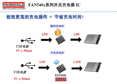 FAN5400系列電池充電器IC使用高集成度開關模式充電器,以便最大限度地縮短從USB電源為單節(jié)鋰離子(Li-Ion)電池充電的時間,并使用升壓調(diào)節(jié)器從電池為USB外設供電。由于充電電流和電池容量繼續(xù)增加,使用線性充電器通過USB端口或5V AC/DC適配器進行充電的效率變得越來越低,F(xiàn)AN5400的開關模式充電器能夠提供高達94%的效率,有助于加快充電速度并減少熱耗散。