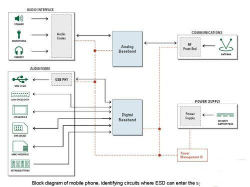 由于手機的設(shè)計對象是大眾消費者,而且可在任何環(huán)境中使用,因此ESD很有可能會進入其中的一個端口或I/O接口,并導(dǎo)致芯片組出現(xiàn)電氣不穩(wěn)定現(xiàn)象或完全損壞。圖2用于幫助說明不同電路該用什么樣的ESD保護技術(shù)。它表明,所有的電路都有可能為ESD進入手機提供一個途徑。