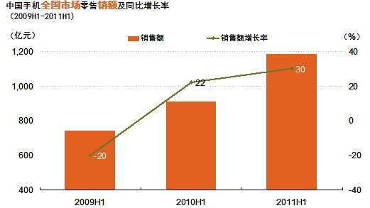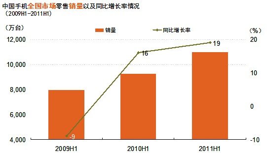 2011年上半年手機(jī)市場(chǎng)繼續(xù)保持較快增長(zhǎng)。據(jù)GfK(捷孚凱中國(guó))全國(guó)零售監(jiān)測(cè)數(shù)據(jù)顯示,2011年上半年銷(xiāo)售量已達(dá)到1.1億臺(tái),同比增長(zhǎng)19%,銷(xiāo)售額達(dá)到1186億元,銷(xiāo)售額同比增長(zhǎng)30%。