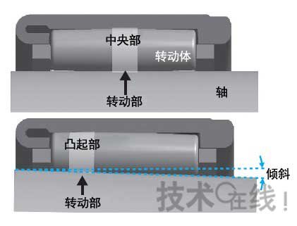 (圖2·噪聲增大的機制:軸傾斜時,滾動體的滾動部從中央部向凸起部移動。凸起部的精度比中央部低,因此產(chǎn)生不穩(wěn),使得噪聲增大)
