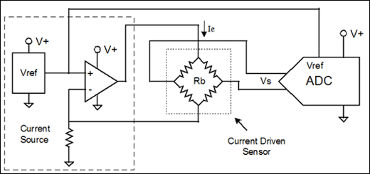 圖4. 該設(shè)計中電流驅(qū)動傳感器的電流源由一個電阻,一個運(yùn)算放大器和一個電壓基準(zhǔn)組成。