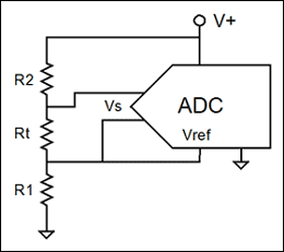 與之相似的采用電流驅(qū)動傳感器和單元件阻性傳感器(如RTD)的技術(shù)已不常用了。這些電路中ADC的靈敏度會隨溫度或電源電壓的變化而變化。雖然如此,ADC和傳感器輸入的組合還是相當(dāng)穩(wěn)定的。