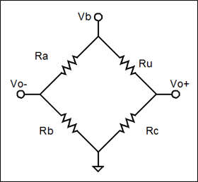 圖9是一個由同一電壓源供電的兩個分壓器組成的惠斯通電橋。習(xí)慣將電橋畫成菱形,因?yàn)檫@種形狀強(qiáng)調(diào)了同一電壓源為每個分壓器供電的重要性。電橋的輸出(Vo)是兩個分壓器輸出電壓之差(公式15)。當(dāng)Vo為零時,稱電橋達(dá)到平衡。在這種條件下,因?yàn)閂e與一個為零項相乘,所以激勵電壓(Ve)的精確值并不重要。公式16可計算出平衡電橋中未知電阻(Ru)的阻值。在實(shí)際應(yīng)用中,通常使Ra = Rb,這樣公式16可簡化為Ru = Rc。