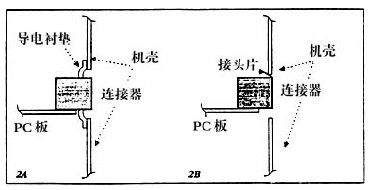 屏蔽連接器方法有,加指形簧片或墊片。連接器的搭接,是在連接器和機(jī)殼之間填滿空處。這個(gè)方法要求有一個(gè)襯墊(圖2A)。金屬襯墊較好,只要處理合適,也就是說(shuō),只要表面不被污染,只要手不觸及或損壞襯墊以及只要有足夠的壓力,以保持好的、低阻抗的接觸。