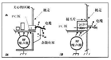 使共模電流注入到I/O區(qū)的另一機(jī)理,是附近有強(qiáng)的干擾源的耦合。甚至有些“屏蔽”連接器也無(wú)用,因?yàn)楦蓴_源就在連接器附近,如PC機(jī)環(huán)境。如果在連接器和底板之間有一個(gè)缺口,此處所感應(yīng)的RF電壓可以使EMC性能下降(圖1B)。