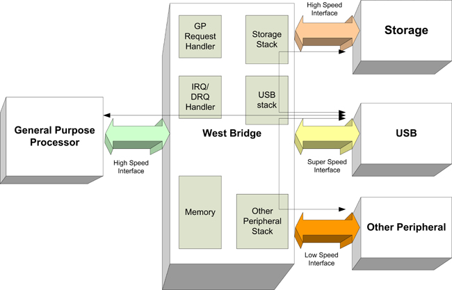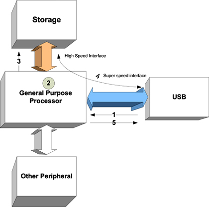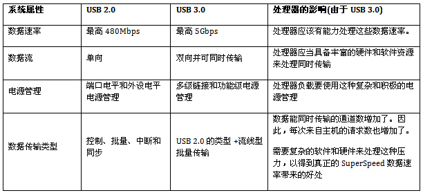 在一個普通的場景中,在device端,處理器直接連接到USB、存儲器和外設(shè)。記住這種結(jié)構(gòu),由High-Speed過渡到SuperSpeed,處理器的影響可以概括如下: