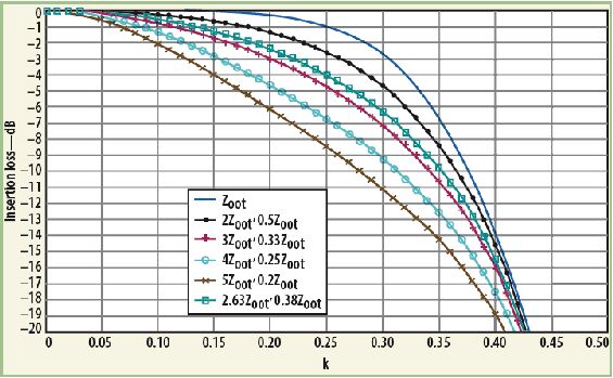 圖4中,對于優(yōu)化和非優(yōu)化的特性阻抗值,都把插損看作k的函數(shù)。相比采用了優(yōu)化特性阻抗的情況,特性阻抗非優(yōu)化時,插損增加,帶寬減小。于是,使用絞合傳輸線很容易獲得最佳特性阻抗值。