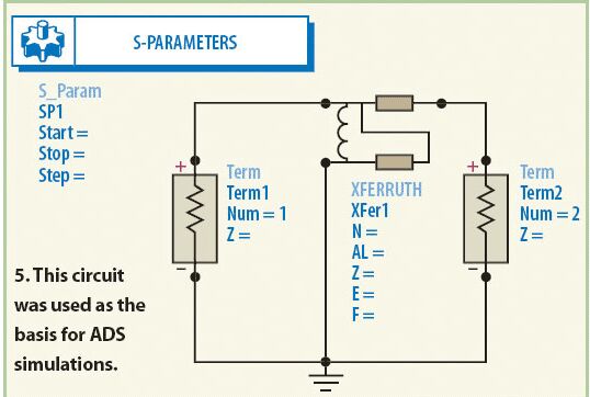 為了對變壓器響應(yīng)進(jìn)行散射參數(shù)(S參數(shù))仿真,ADS采用它的S_Param建模器,按照規(guī)定的步長和刻度步長調(diào)節(jié)初始(開始)的和最終(停止)的掃頻頻率。源和負(fù)載阻抗由一個阻抗值為Z的、被稱為Term的特殊終端表示。圖5所示為ADS仿真中所用的電路。