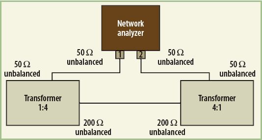 測量在Advantest的一個商用VNA,300kHz至3.8GHz模型R3765CG上進(jìn)行。這個分析儀配有50Ω端接阻抗的非平衡測試端口。由于寬帶unun阻抗變壓器具有非平衡終端,轉(zhuǎn)換比率為1:4,為了讓該器件與測試設(shè)備相匹配,需要另一個轉(zhuǎn)換比率為4:1的器件來執(zhí)行阻抗轉(zhuǎn)換。圖6和圖7顯示了所有的終端連接。測試終端和所有用于VNA的線纜都經(jīng)過校準(zhǔn),以最大限度地減少它們出現(xiàn)錯誤的可能性。插損和通帶響應(yīng)利用表示為對數(shù)幅值形式的傳輸系數(shù)S21來分析。
