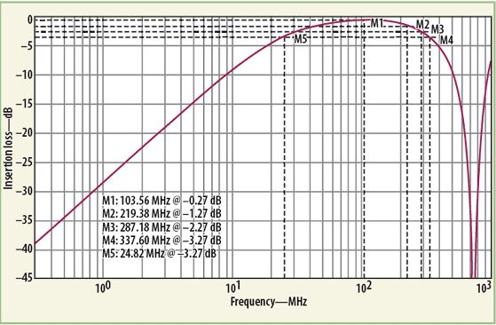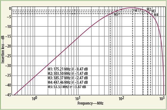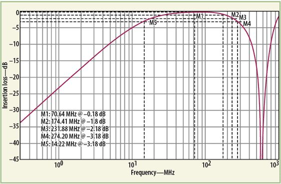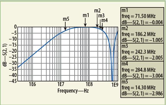 MathWorks的MATLAB數(shù)學(xué)分析軟件曾被用來分析這種變壓器器件模型的響應(yīng)。分析中,把單獨的低頻(公式1)響應(yīng)和高頻(公式5)響應(yīng)的插損響應(yīng)結(jié)合在了一起。將所需的目標(biāo)值代入MATLAB公式,可獲得寬帶變壓器的最終響應(yīng)。為了執(zhí)行MATLAB模型數(shù)值響應(yīng)的電氣仿真,使用了ADS建模軟件。該軟件有一個很有用的內(nèi)部源模型,稱為XFERRUTH,其變量參數(shù)包括匝數(shù)(N)、電感因子(AL)、傳輸線特性阻抗(Z)、傳輸線電氣長度(E),以及計算傳輸線長度所需要的參考頻率(F)。