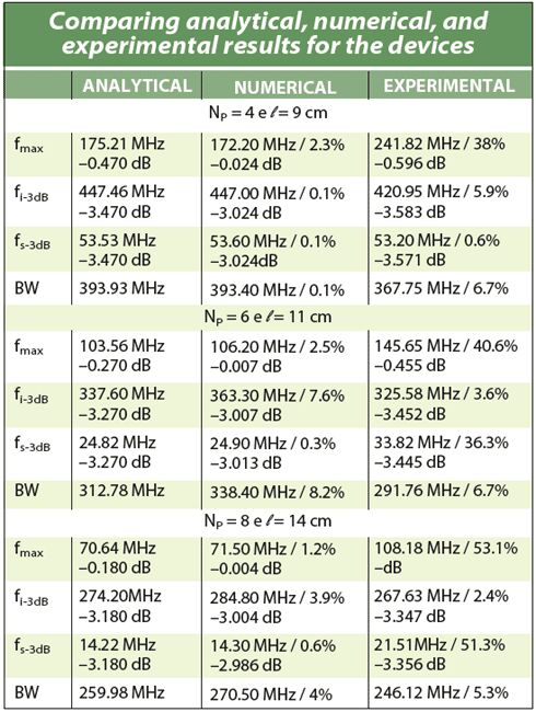 構(gòu)建的第一個器件線圈匝數(shù)為4,因此傳輸線長度為9cm。圖8、9和10分別顯示了分析、數(shù)值和實驗三種情況下的頻率插損行為。表中總結(jié)了主要的參數(shù)值,包括最大幅值、-3dB頻率(fmax、fi-3dB和fs-3dB)、適當(dāng)?shù)膸挘˙W),以及相比模型值頻率偏差百分比下的各種插損結(jié)果。通過分析、數(shù)值和實驗方法獲得的結(jié)果間的偏差非常小,信號頻率最大時例外。這都是由于測量設(shè)置中噪聲和其它寄生效應(yīng)造成的測試系統(tǒng)的局限性。在幅度基本穩(wěn)定的測試頻帶上,信號電平的變化是幾乎察覺不到的,也許這就是最大信號幅度頻率的報告中出現(xiàn)偏差的原因。