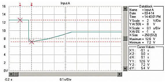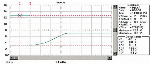 由于RM、RB、RL均非常低,啟動電流非 常大。例如用12V、45Ah的蓄電池啟動安裝1.9升柴油機的汽車,蓄電池的電壓在啟動瞬間由12.6V降到約3.6V!啟動過程的蓄電池電壓波形如圖 1;啟動瞬時的電流達550A,約為蓄電池的12C的放電率!啟動過程的蓄電池電流波形如圖2,(電流傳感器的電流/電壓變換比率:100A/V)。盡管 車用蓄電池是啟動專用蓄電池,可以高倍率放電,但在圖1中可以看出,10倍以上的高倍率放電時的蓄電池性能變得很差,而且,如此高倍率放電對蓄電池的損傷 也是非常明顯的。啟動過程的電壓劇烈變化也是極強的電磁干擾,可以造成電氣設(shè)備的“掉電”,迫使電氣設(shè)備在發(fā)電機啟動過程結(jié)束后重新上電,計算機在這個過程中非常容易死機。因此,無論從改善汽車電氣設(shè)備的電磁環(huán)境還是改善汽車的啟動性能和蓄電池的性能、延長使用壽命來考慮,改善汽車電源在啟動過程的性能是必要的。