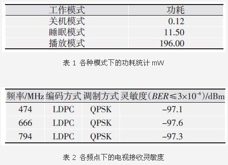 智能手機(jī)平臺系統(tǒng)測試,除了通信部分的基本指標(biāo)外,對于手機(jī)電視而言,最關(guān)鍵的指標(biāo)是各種模式下的功耗和接收靈敏度。測試平臺采用CMMB信號發(fā)生器、誤碼測試儀、萬用表和待測智能手機(jī)等組成,測試結(jié)果如表1、表2所示。