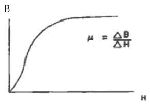 對于一種磁性材料來說,磁導(dǎo)率不是一個常數(shù),它與磁場的大小、頻率的高低有關(guān)。當(dāng)鐵氧體受到一個外加磁場(H)作用時,例如當(dāng)電流流經(jīng)繞在鐵氧體磁環(huán)上的線圈時,鐵氧體磁環(huán)被磁化。隨著磁場強度(H)的增加,磁通密度(B)增加。當(dāng)磁場(H)增加到一定值時,B 值趨于平穩(wěn),即達(dá)到飽和狀態(tài)。對于軟磁材料,飽和磁場(H)只有十分之幾到幾個奧斯特。隨著飽和的接近,鐵氧體的磁導(dǎo)率迅速下降并接近于空氣的導(dǎo)磁率(相對磁導(dǎo)率為 1)如圖 1 所示。