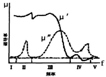圖 3 是磁導(dǎo)率的頻散特性曲線,它可分為Ⅰ-Ⅴ個區(qū)域來分析??梢?,在一定的頻率范圍內(nèi) μ'''' 值(在某一磁場下的磁導(dǎo)率)保持不變,然后隨頻率的升高磁導(dǎo)率 μ'''' 有一最大值。頻率再增加時,μ'''' 迅速下降。代表材料損耗的虛數(shù)磁導(dǎo)率 μ" 在低頻時數(shù)值較小,隨著頻率增加,材料的損耗(即μ")增加。