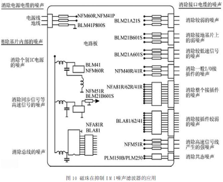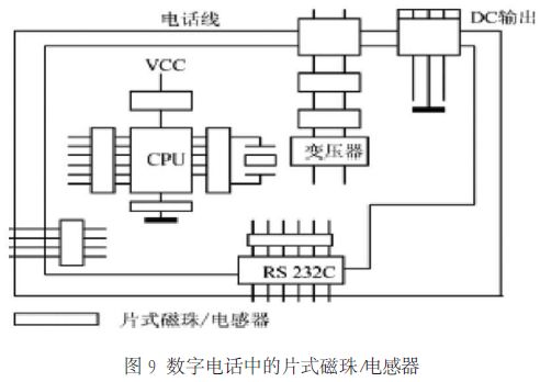 圖8、圖9、圖10 分別示出了磁珠在直流供電回路、數(shù)字電話、抑制 EMI 噪聲濾波器中的應(yīng)用實例。