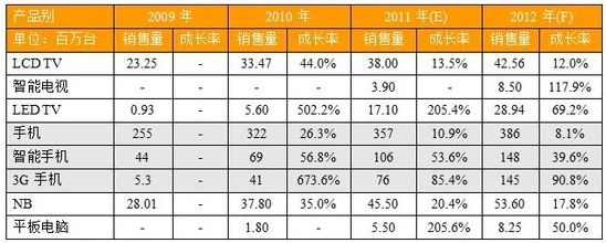 2012年中國大陸主要消費電子產(chǎn)品銷售量預估