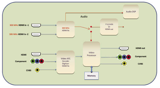 以4K系統(tǒng)為例,圖1所示的是一個(gè)典型的支持4K的系統(tǒng)。支持300MHz的接口由HDMI來實(shí)現(xiàn)。系統(tǒng)接收了4K的信號(hào)后,可以以兩種方式處理: