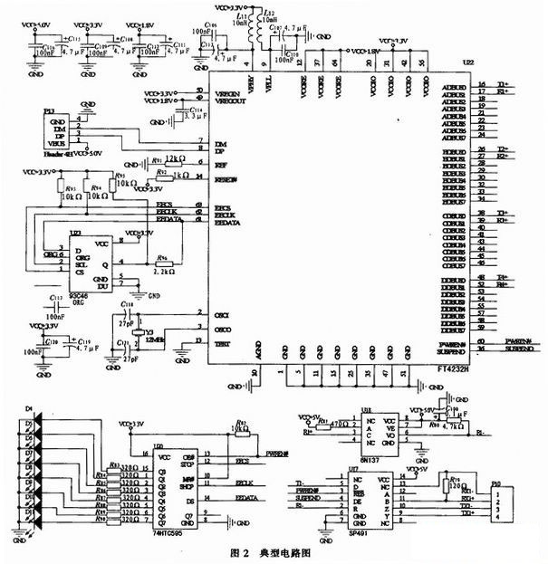 整個(gè)系統(tǒng)的供電來(lái)源于USB接口的+5 V;因此芯片工作在USB總線供電模式,典型電路如圖2所示,采用標(biāo)準(zhǔn)的USB接口P1,F(xiàn)T4232H提供了標(biāo)準(zhǔn)的發(fā)送TX和接收RX引腳輸出輸入線,因此與外設(shè)的連接方式非常靈活、方便。跟RS422的連接方式如圖中所示,為方便只給出了發(fā)送和接收兩組差分信號(hào)線,通過(guò)PWREN#和SUSPEND#的輸出來(lái)控制信號(hào)的發(fā)送和接收。圖中94C46是一片串行的EEPROM,用于存儲(chǔ)產(chǎn)品的VID、PID、設(shè)備序列號(hào)以及與設(shè)備相關(guān)的文字說(shuō)明,芯片的容量大小可以根據(jù)用戶需要進(jìn)行選擇,本文中選用的是容量為1 K的芯片。雖然轉(zhuǎn)換器在沒(méi)有EEPROM芯片一樣可以正常工作,但這時(shí)設(shè)備的工作方式是FTDI公司默認(rèn)的內(nèi)容,如果用戶想寫(xiě)入自己的VID、PID等信息必須外接一片EEPRO-M,其具體內(nèi)容有一定的格式,本設(shè)計(jì)的工作方式是FTDI公司默認(rèn)的。